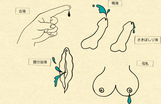 HIVは感染している人の体液の中にふくまれている。どんな体液の中にあるんだろう? …血液・精液・さきばしり液・膣分泌液・母乳 また最近では、腸粘膜から出てくる粘液にも、HIIVがふくまれるという報告がある。腸粘膜から出てくる粘液はもともと、便がスムーズに排泄されるような潤滑剤の役目をしている。